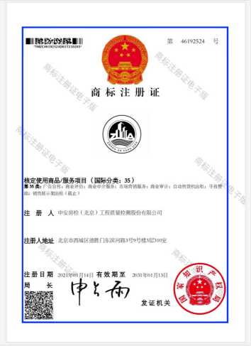 商标是企业的无形资产,是区别本企业与其他企业商品或服务的重要标志。公司自成立以来,就把公司的品牌文化宣传及推广作为企业发展的重要任务,公司logo的使用是主要表现形式。公司logo采用天圆地方设计理念,借瞄准器之形,意指中安房检严谨公正、专注专一、科学客观的作风,把权力放在规矩里,适其所用,绝不为其一人以权谋私;同心圆内有五栋建筑或五把剑或五展帆船,上部整体似龙舟。建筑代表中安房检的涉足领域,利剑代表胜利吉祥;下部整体代表涌动的大海,实现中安房检伟大理想目标,要有海一样的胸怀。中安房检人拼搏进取奠根基,才能在浩瀚的大海中扬帆远航。商标在企业的品牌视觉识别系统里发挥极为重要,例如……在文件的使用上,从方案到委托书,从合同、资质文件到检测报告,有印有公司标志。在物品的使用上,上岗证、桌签、吊牌、名片、笔记本、档案盒、档案袋等,无处不在……经申请,公司于2021年1月14日通过国家知识产权局商标注册,有效期截至2031年1月13日。国际分类:35类。服务项目包括:广告宣传;商业评估;商业中介服务;市场营销服务;商业审计……公司的logo通过商标注册成功后,享有商标专用权和专属权,得到法律有效保护。